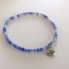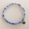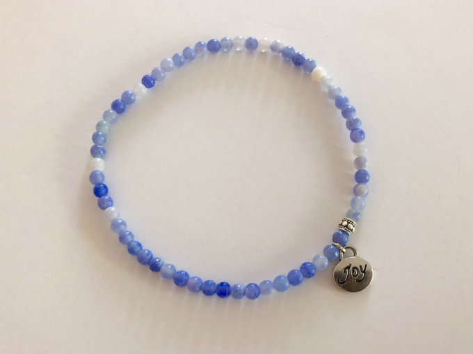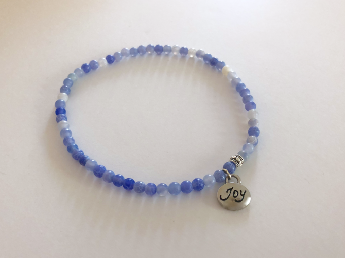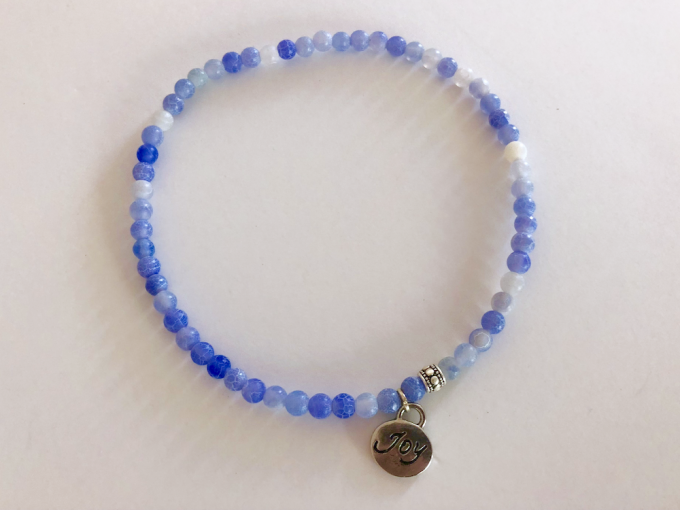 Mauve blue matte crackled agate anklet featuring a Joy charm and silver tube connector. The shades of blue range from soft lavender to almost white. This pretty color is versatile enough to wear with many different outfits and the slip-on style makes it comfortable for walking, the gym or yoga.