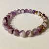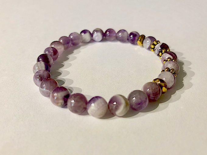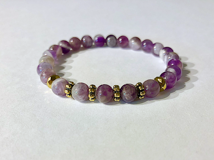 Beautiful 6mm purple amethyst stones with two gold-plated faceted hematite, and four gold tone rondelles will add a touch of elegance to your outfit. This slip-on style bracelet is available in nine sizes and looks good with casual or more tailored outfits. Perfect for any occasion.