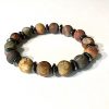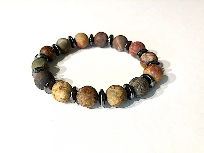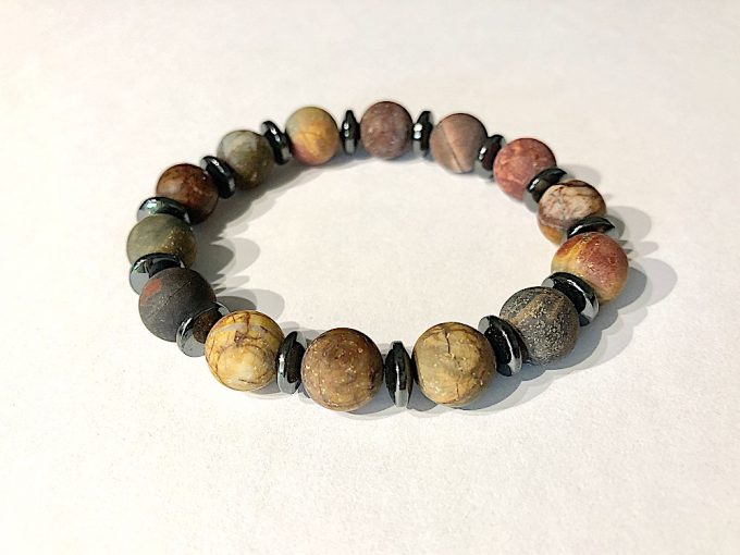 Matte Picasso Jasper is teamed with hematite discs in this beautiful slip-on style bracelet. The swirling colors of the Picasso jasper include brown, gold, green, russet and red and contrast with the hematite discs separating the stones adding to the grounding effect of this bracelet. This bracelet is available in nine sizes and the number of beads will vary depending upon the size chosen.