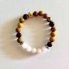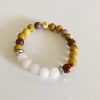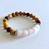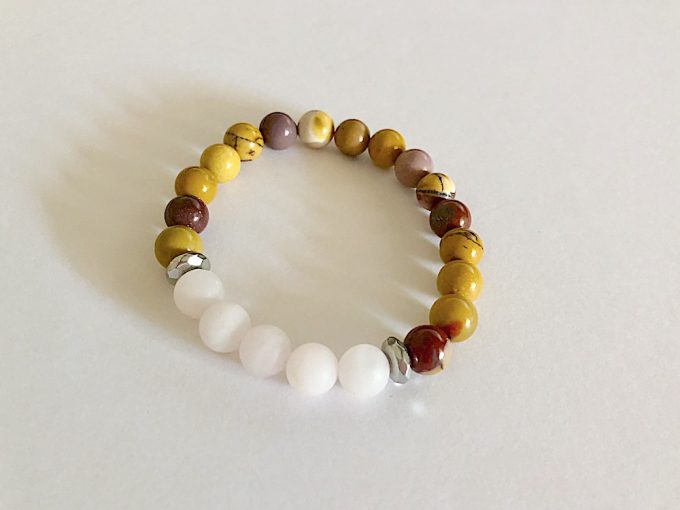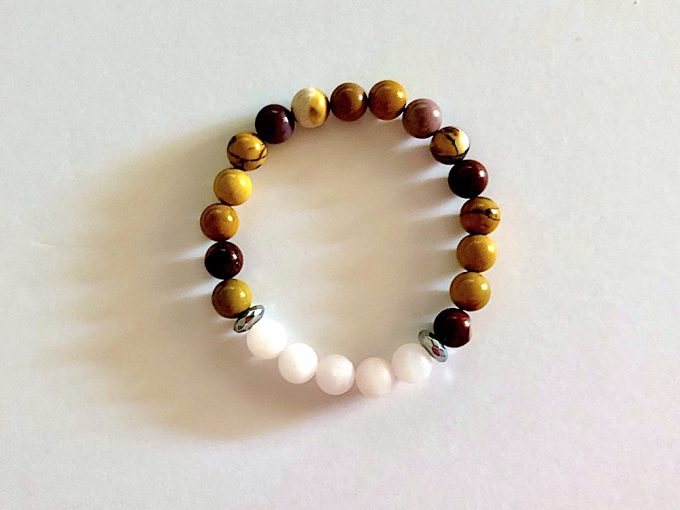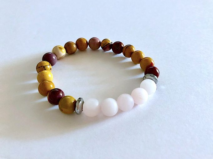 8mm polished mookaite jasper stones combined with matte rose quartz and silver facteted hematite rondelles create this elegant look. This slip-on style bracelet is available in nine sizes and looks good with casual or more tailored outfits. Perfect for any occasion.